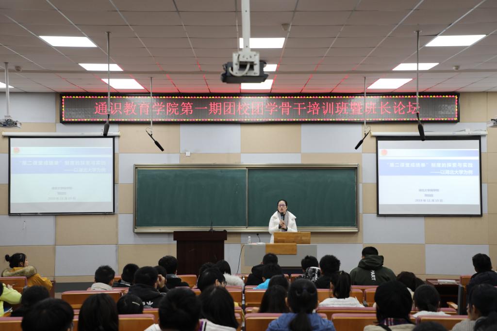 为充分发挥“第二课堂成绩单”制度在“三全育人”中的重要作用,促进和引导大学生积极主动参与文化体育、志愿服务、科技创新、实习实践等各类课外活动,实现德智体美劳全面发展,11月25日晚,通识教育学院第一期团校团学骨干培训班暨2019级班长论坛第三课在B300开讲。湖北大学商学院团委书记郭田田老师为同学们带来了“‘第二课堂成绩单’制度的探索与实践——以湖北大学为例”的主题团课,通识教育学院团委书记吴玉莲及第一期团校团学骨干培训班暨2019级班长论坛的全体学员参与了本次学习。