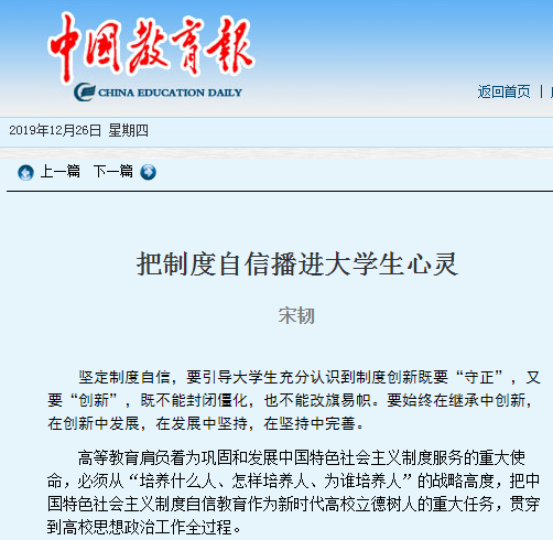 4.2019年12月26日的《中国教育报》理论周刊版发表我院理论研究文章《把制度自信播进大学生心灵》。文中指出,坚定制度自信,要引导大学生充分认识到制度创新既要“守正”,又要“创新”,既不能封闭僵化,也不能改旗易帜。要始终在继承中创新,在创新中发展,在发展中坚持,在坚持中完善。