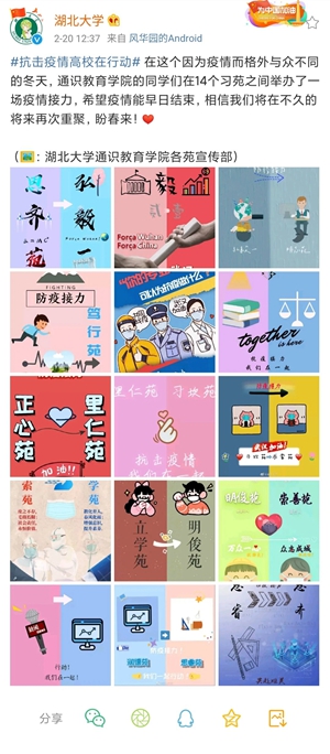 开展政策宣讲。支部成立了由4名党员辅导员和13名学生骨干组成的政策宣讲小组,每天收集汇总习近平总书记关于新冠肺炎疫情防控工作的一系列重要讲话和指示精神,以及党中央、国务院、湖北省委、武汉市委和湖北大学党委的各项决策部署,并通过海报、漫画、vlog微视频、班级官Q接力等学生喜闻乐见的形式全覆盖开展政策宣传,第一时间把党和政府的权威声音传递到每位同学。开展“致敬最美逆行者”主题宣传,紧跟流量热点大力宣传医护等防疫一线人员先进事迹,宣传钟南山、李兰娟、张定宇、援鄂医疗队、快递小哥王勇等各种先进典型,厚植为民、爱国、奋斗精神,加强社会主义核心价值观教育,在学生中营造同心战“疫”的强大正能量。