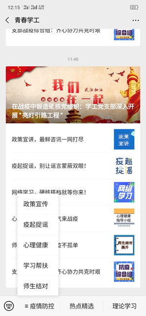 学工党支部坚持把学生的生命安全和身体健康放在第一位,坚持围绕学生、关照学生、服务学生,时时在线,有问必答,关爱不断线,隔离不隔爱,用心为学生健康服务。