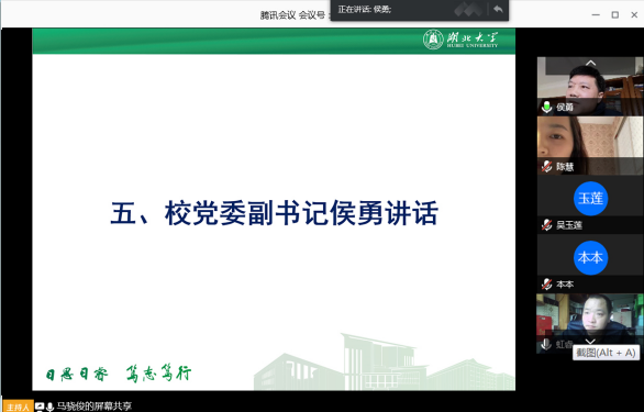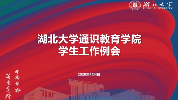 侯勇充分肯定了通识教育学院的疫情防控和人才培养工作,对学院以“亮灯引路工程”和“共抗疫情、爱国力行”志愿服务队为载体统筹做好疫情期间的学生工作给予高度评价。他说,近期学校印发了《湖北大学2020年党政工作要点》,对今年的各项工作进行了部署,通识教育学院要认真学习、狠抓落实,为完成全年的工作目标贡献通识力量。要按照学校党委要求,紧密结合通识实际,统筹做好疫情防控和学院改革发展各项工作,科学精准、稳中求进,做到保一方平安、促一方发展。他指出,通识学生工作是全校学生工作的重要组成部分,是学生成长和辅导员发展的“第一站”,要坚持人才培养和队伍建设两手抓,培养时代新人,锻造过硬队伍。疫情防控期间,学生工作要坚持以疫情防控为先,以立德树人为要,以爱国力行为魂,把战“疫”与育人紧密结合,因时而进、因事而化、因势而新,在疫情防控实践中提高育人效果,以育人成效助力疫情防控,促进校园小课堂与社会大课堂同频共振,在同心战“疫”中把立德树人根本任务落到实处。