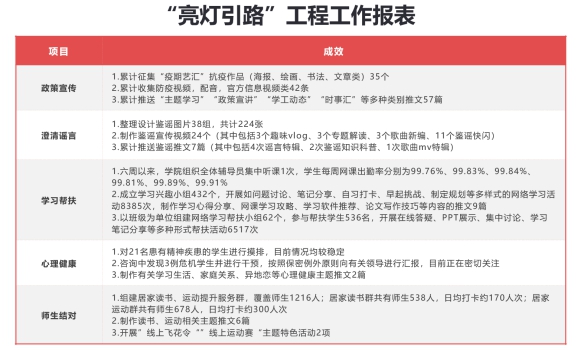 据了解,新学期网络教学开始以来,通识教育学院发挥学工党支部全国党建工作样板支部的示范带头作用,巩固深化“亮灯引路工程”湖北省高校优秀校园文化一等奖建设成果,把疫情防控和人才培养紧密结合,制定《关于在新冠肺炎疫情防控工作中深入实施“亮灯引路工程”的实施方案》,把全体辅导员编成政策宣讲、网络学习指导帮扶、心理健康疏导、师生结对提升、疫起鉴谣和综合督导等6个小组,从政治引领、发展引航、服务引导、心理引路等方面,加强学生思想政治教育,促进学生全面发展,并成立“共抗疫情、爱国力行”志愿服队,262名辅导员和学生自愿加入开展各种抗疫志愿服务,实现了疫情防控和学生工作同步推进,确保同学们“停课不停学、学习不延期、成长不掉线”。