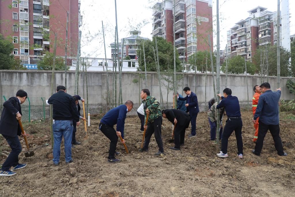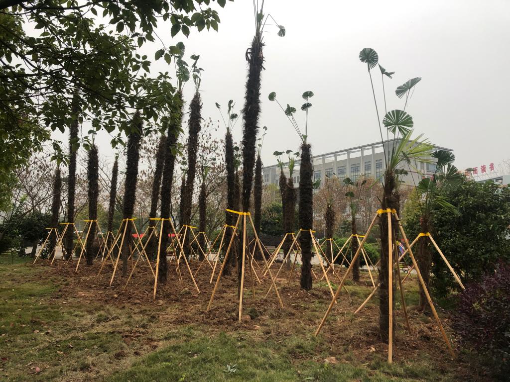 经过大家两个多小时的默契配合,一批楠竹、棕榈树、冬青、桂花树、樟树、枇杷树在校园内和鄢家湖边迎风挺立,格外引人注目。