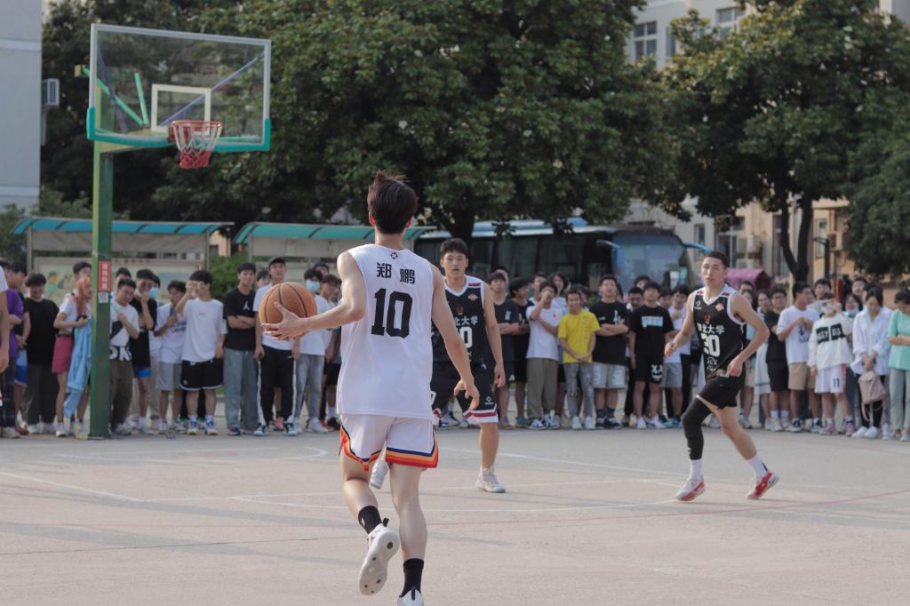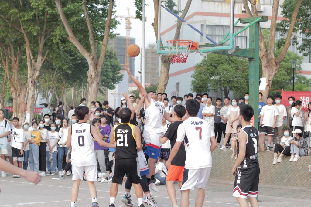 比赛在第二节时陷入了僵持,双方球员在场上展开了对球权激烈的争夺,阳逻校区球员郑鹏稳稳接过队友的传球,踮脚、瞄准、纵身一跃,投入了本场第一个三分。现场的观众一阵欢呼呐喊,点燃了球员们的斗志,两队比拼愈发激烈。