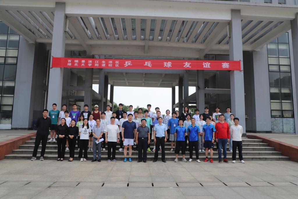 5月31日下午,湖北大学阳逻校区、百瑞景滨江生活区乒乓球友谊赛在问津楼三楼中厅乒乓球室举行。本次交流赛邀请到了湖北铁投大桥地产开发有限公司董事长宋晖、副总经理易建华、综合部副部长高翔及财务顾金。阳逻校区由学院办公室主任、工会主席彭显彪带队,安全保卫部部长黄光辉、心理健康中心负责老师周慧玲、学生辅导员程垚瑞和刘勇参赛,与百瑞景滨江生活区代表球员进行对阵。