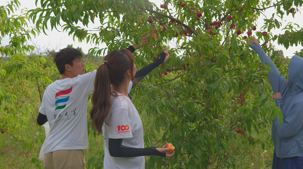 在西安新未来劳动教育研学实践基地,实践团队亲自参与到劳动体验、直播体验感受、分享劳动心得。在基地张老师、陈老师的带领下,实践团队参观万果园并与老师进行沟通。步入桃园,实践团队队员体验采摘桃子的过程并学习相关知识。根据陈老师的介绍,队员了解到桃子除了直接食用鲜果,还可以加工制作成果脯和罐头,甚至还可以食用核仁。果子成长的过程中要进行蔬果,必须在一开始舍去一些果子,这样才能保证最后留下来的果子能长大有营养。在采摘的开始,队员们都很兴奋,但等到采摘结束后,才发现自己腿上已经有了很多被蚊虫叮的包,身上也都是桃子的绒毛,但品尝到自己采摘的桃子的时候大家还感觉桃子很甜,也很有收获。“万果园是我们的主要教育园区,在这里学生们可以春季赏花授粉,夏季蔬果养护,秋季采摘储存,冬季剪枝保暖,不同的季节可以体验不同的课程,我们的每次课程也不紧紧围绕着劳动部分,更要教会孩子们辨别不同的水果、果树,掌握水果生长的普遍规律,还要给他们传递劳动最光荣、劳动最崇高、劳动最伟大、劳动最美丽的理念,希望他们在以后的日子里热爱劳动,尊重劳动。今天,你们能到劳动基地进行实践我是很激动的,希望你们也能更多地参与社会实践,带动更多的同学、朋友走出课堂,走向社会,弘扬我们的劳模精神、工匠精神,以后成为我们社会的栋梁。”张老师告诉队员们。