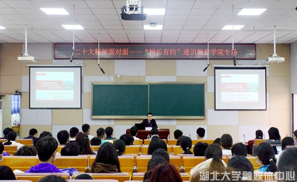 “校长有约”环节,大学生们围绕学习党的二十大精神等提出疑问,寻求帮助,刘建平认真倾听、耐心解答。工商管理类专业大一学生程玉洁表示,“作为新时代的大学生,在听了刘校长关于党的二十大精神的宣讲后,我感受颇多。刘校长讲解内容通俗易懂,让我更加清晰地领悟到当代青年的责任。在宣讲中,刘校长多次提到‘奋斗’,这激励着我勇担责任、努力拼搏,不负每一寸光阴。” 国际事务与国际关系专业学生揭予乐说,“刘校长全面讲解了党的二十大精神,回应了我们关心关切的重点……这些都让我感受到学校对我们大一新生的关心和支持。校园网、教学设施、学生宿舍、校医院设施及应急机制等硬软件设施将要提档升级改造,我相信,我们阳逻校区也会发生天翻地覆的变化,成为湖北大学学科建设提质进位的助推者。”