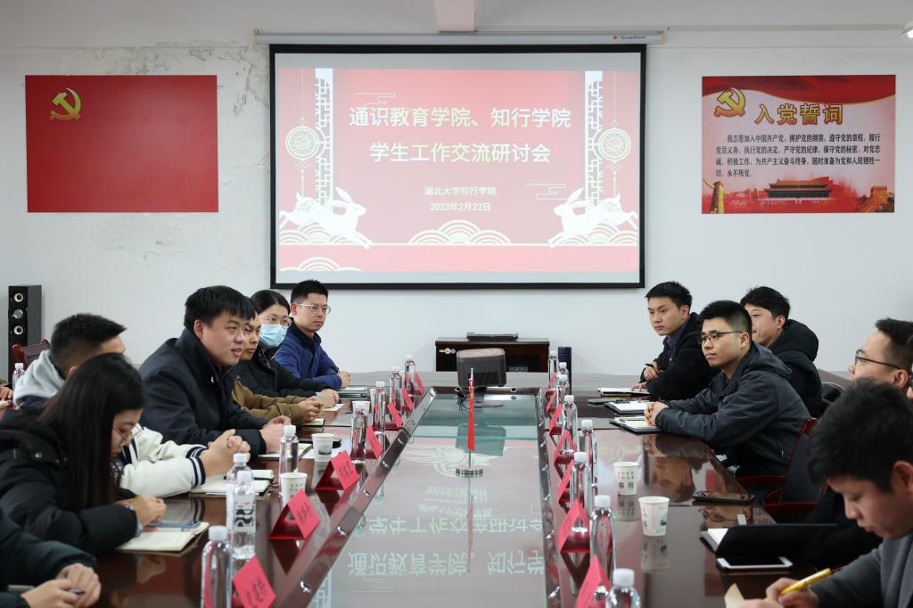 2023年2月22日,湖北大学通识教育学院党委副书记韩凯及辅导员代表一行赴知行学院,开展学生工作交流研讨会。知行学院学生工作处处长王刚主持会议,知行学院辅导员代表参加交流会。