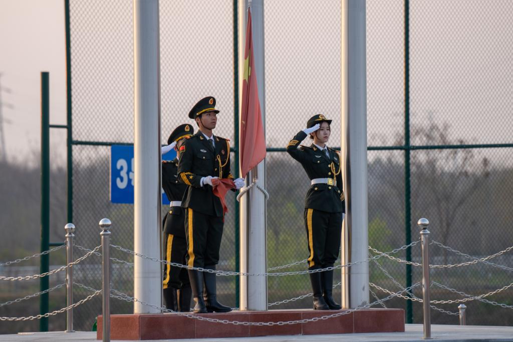 迎着晨光,国旗护卫队成员将国旗扬起。全体师生庄严肃立,向国旗行注目礼,奏唱国歌。