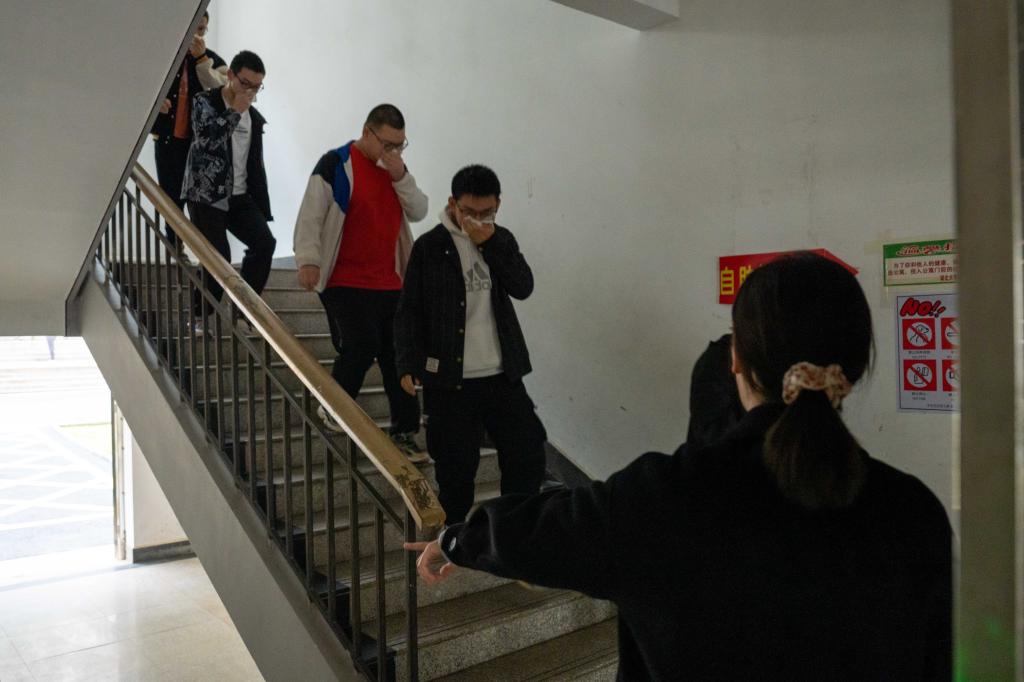 此次“沉浸式”演练分为:报警演练、学生宿舍安全疏散、灭火及消防设备使用培训、消防救援器材参观四个阶段。发生“火情”后,宿管工作人员第一时间向校区值班人员报告,工作人员按照预案,分别报119火警和学院领导,各部门迅速联动开展救援。学生们听到火灾警报后,用湿毛巾捂住口鼻,在疏散组老师的引导下从就近出口迅速撤离,再以寝室为单位在2号篮球场集合清点人数。消防员进入楼栋解救“火灾伤员”,打开消防水管,扑灭模拟起火点。他们还通过消防云梯,顺利对高层被困学生实施救援,医疗卫生组对“伤者”做紧急处置。整个救援工作有条不紊推进,在阳逻救援站25位消防员的帮助下,校区各部门分工协作,对模拟火灾进行了妥善处置,提高了保卫、后勤、学工三支队伍的联动处突能力。