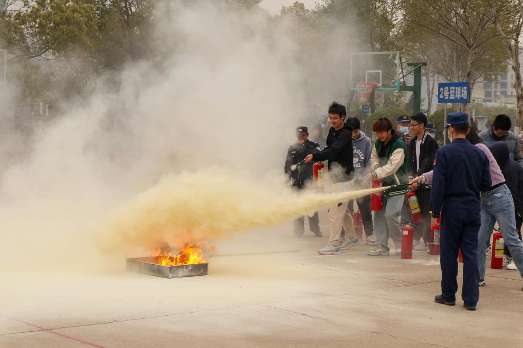 疏散演练后,同学们还集中在2号篮球场学习了消防器材的使用方法。“首先手提把手,再拔掉灭火器保险销,将灭火器喷管瞄准火源,最后压住灭火器开关,喷出干粉灭火……”消防员在安全区域点燃火盆,现场演示灭火扑救过程,同学们积极实操,检验现场学习成果。消防救援站丁巍一边演示设备,一边不忘提醒广大师生,不要在宿舍使用违规电器,在校园内使用可燃物时一定要注意用火安全,“如果火灾发生的话,你们要第一时间逃生,保护好自己的安全,灭火的问题交给我们!”