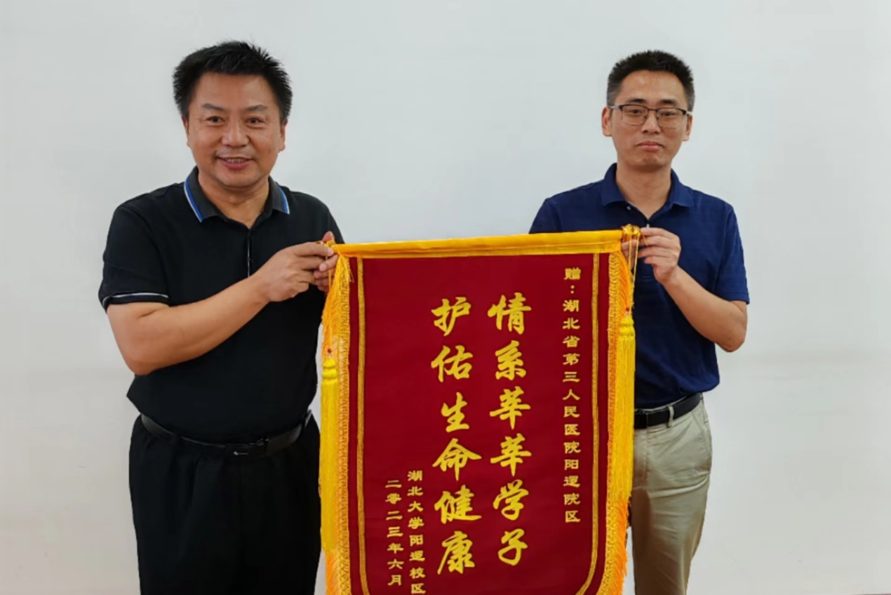 (图:杨元业向湖北省第三人民医院阳逻院区赠送锦旗)