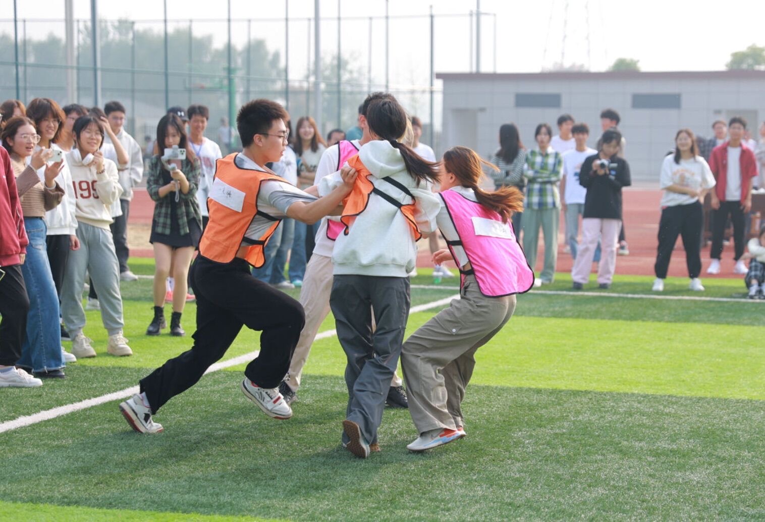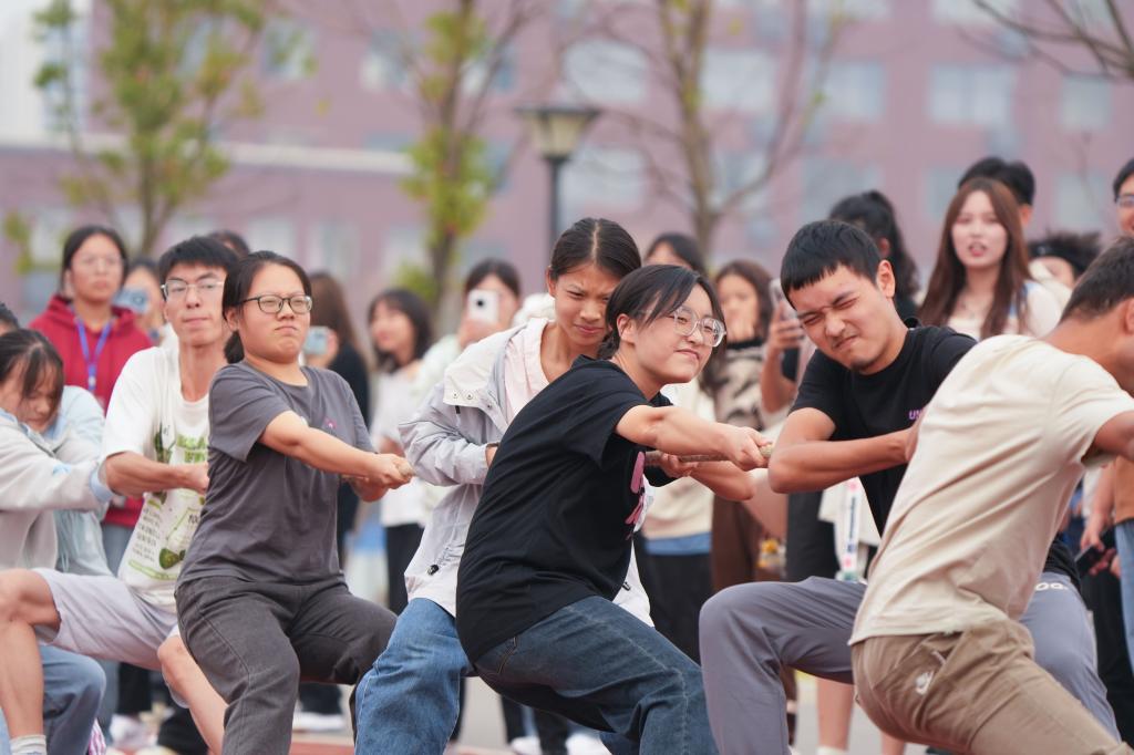 除此之外,本次运动会还新增了许多团体趣味类项目。跳大绳比赛中,跳绳运动员们相互配合,用拼搏和汗水定格动人瞬间。伴随着“一二一”的呐喊声,拔河比赛开始了,参赛运动员齐心协力,铆足全力,“紧紧”地咬住对方;踩气球比赛中,同学们把五彩气球系在脚腕,聚精会神,灵活跳动;撕名牌比赛中,紧张刺激的气氛笼罩全场,参赛者不仅要团队协作,还需眼观六路、耳听八方,灵活出击……