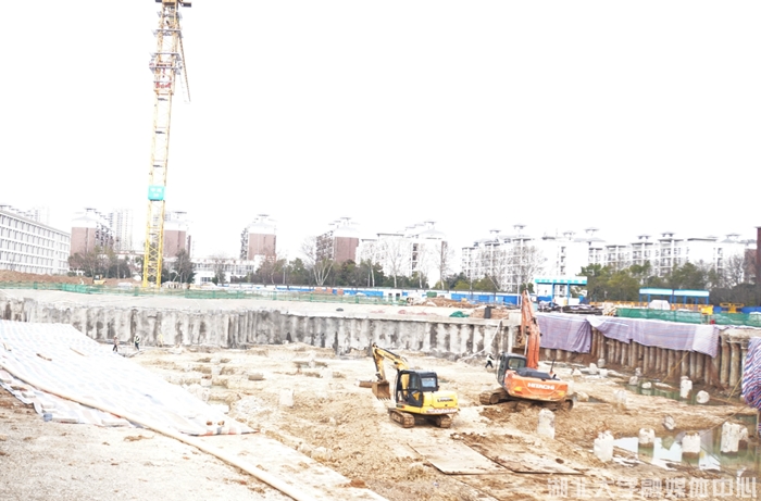 记者在现场看到,产教融合中心施工如火如荼,项目正处于地下室结构施工阶段,3台挖掘机和2台塔吊正投入施工,80多名工人进行着地下室底板施工及内架搭设、基坑土方开挖和积水抽排等工作,其中地下室底板完成20%,土方开挖完成80%,预计今年3月底主体工程达到“正负零”转入地面施工。