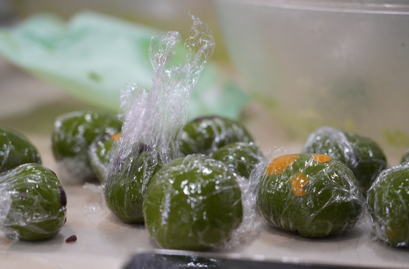 青团预拌粉倒入盆中、热水烫开揉成面团、包入不同搭配的馅料、轻轻捏合揉圆……学生们提前在线上预习过制作步骤,实战时做得有模有样,青翠圆润的青团一个接一个地出现在学生们的手中。