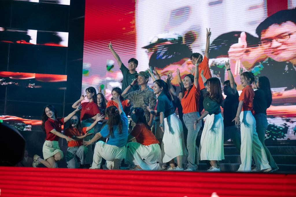 此外,学长学姐的奋斗故事分享、军训旅旅长及辅导员的歌曲串烧《指导员阵线联盟》、小品《HELLO!厂状元》等节目,不仅展现了我校师生的团结与力量,也引导新生思考个人成长与社会责任。男子群舞《大河之子》与歌伴舞《繁星璀璨的天空》更是将晚会推向高潮,展现了青年学子的爱国情怀与青春情怀。