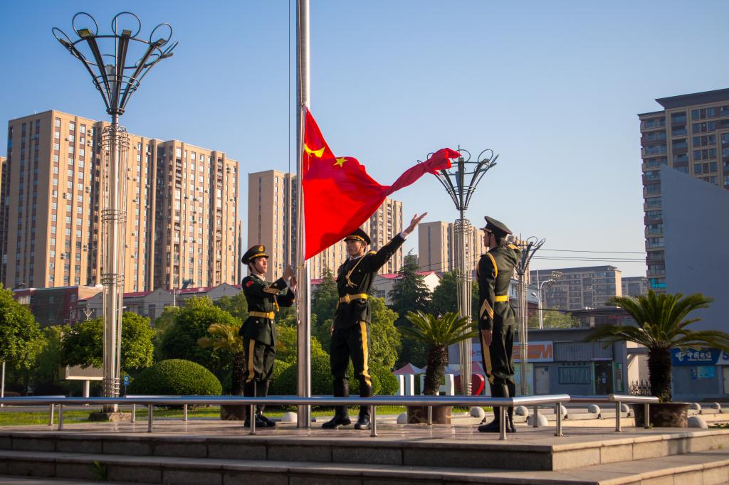 7时整,伴随着《义勇军进行曲》的激昂旋律,五星红旗在朝阳中冉冉升起,全体师生肃立注目,齐唱国歌。