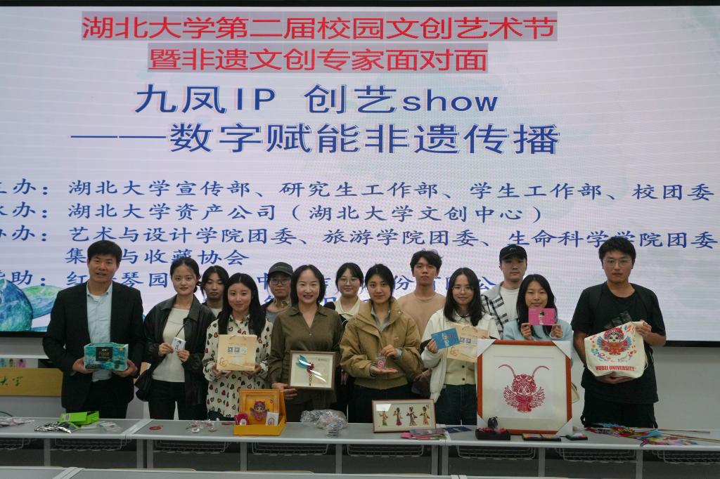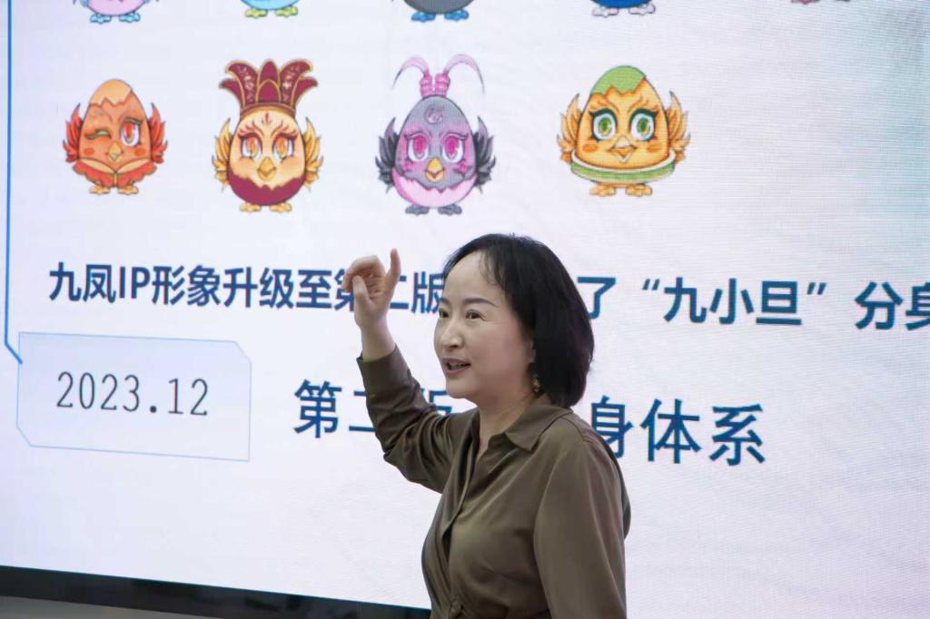 周丽玲现场展示了荆楚文创形象——九凤 IP 的多元成果,并阐述了以“时代性、地方性、青年性”为核心的设计理念体系。“我想运用现代新媒体技术为戏曲文化赋能,打造出更多具有湖北地方特色的文创形象,让中华优秀传统文化在创新中焕发新生。”周丽玲表示。