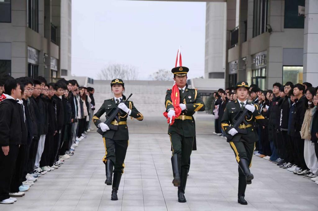 本次活动以“学宪知责勇担当,强国有我赴新程”为主题。早晨,师生代表整齐列队,护旗手步伐铿锵,将国旗护送至旗杆下。在庄严的国歌声中,五星红旗冉冉升起,全场师生肃立齐唱。