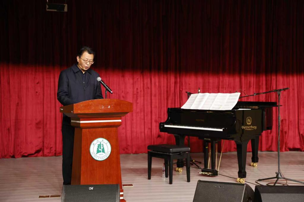 仪式环节,高桂林代表校区管委会致辞。他表示,本场音乐会标志着年度“万象剧场·新青年艺‘述’季”活动圆满收官,也为即将到来的跨年游园会奏响序曲,集中展现了学校文化育人成效与美育成果。他感谢校工会的组织协调与王希翀老师的捐赠,并承诺校区将用好捐赠资源,持续优化美育环境,助力学生全面发展。