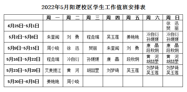 附:2022年5月阳逻校区学生工作值班安排表