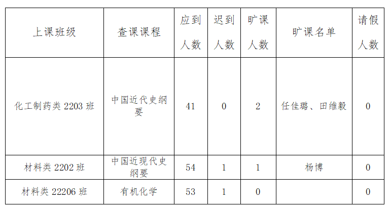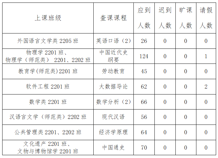 为深入学习贯彻党的二十大精神,构建优良学风建设长效机制,根据学工处要求,4月11日上午,通识教育学院集中对学生课堂进行了专项检查,其中3-4节课检查结果如下:
