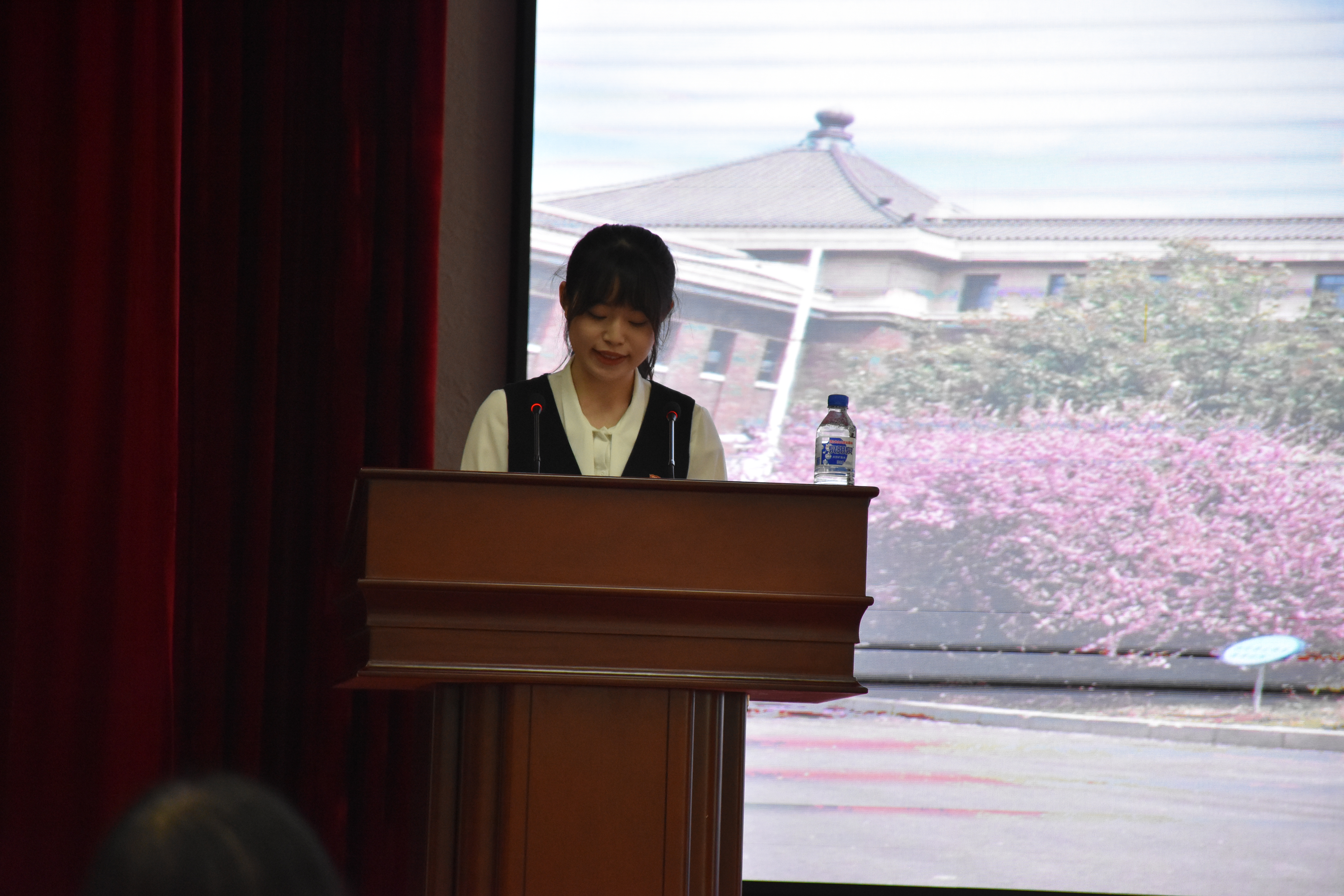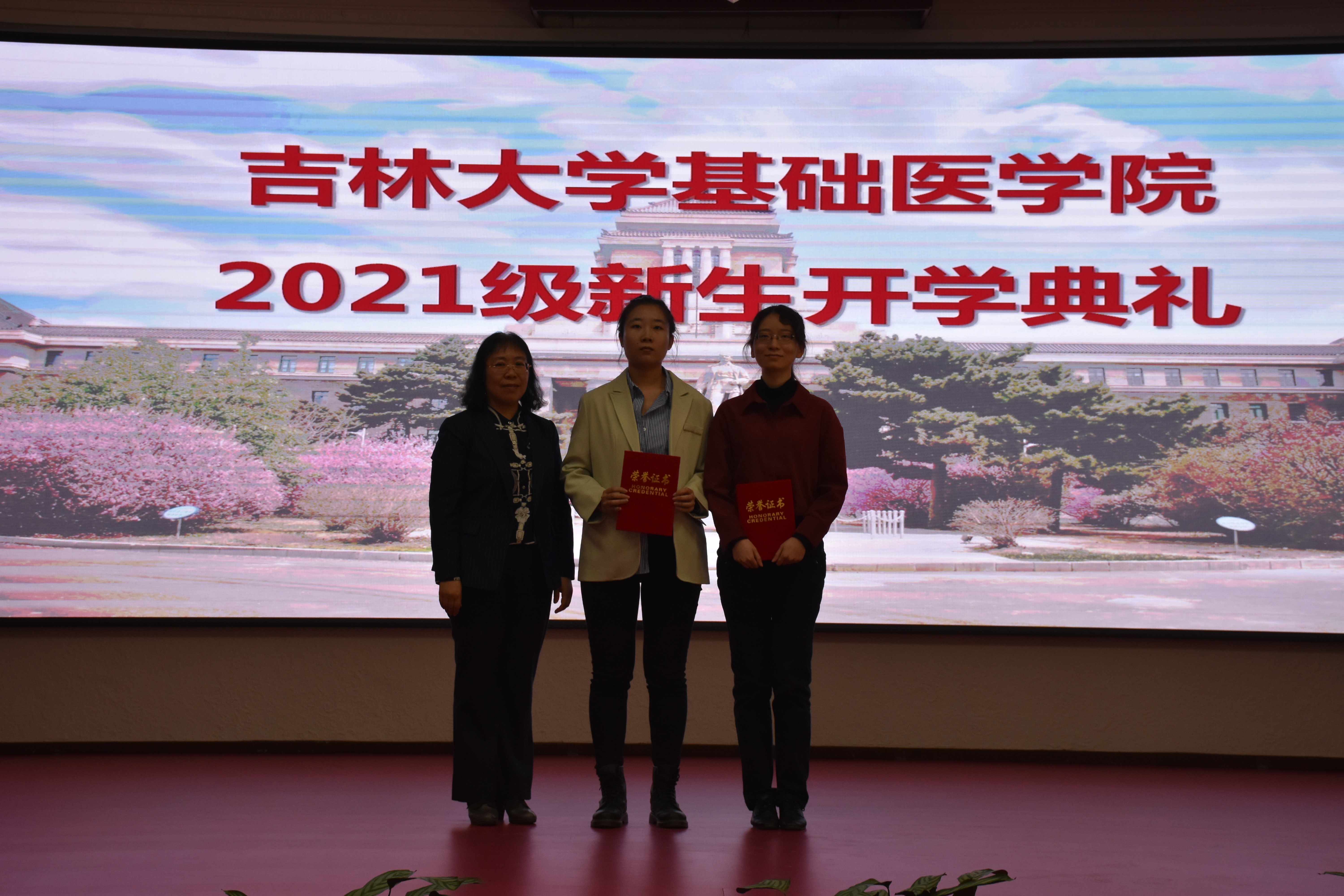 副院长李洪岩宣读2021级新生名单,党委书记王晓荣为2019-2020年度国家奖学金获奖学生代表颁奖。