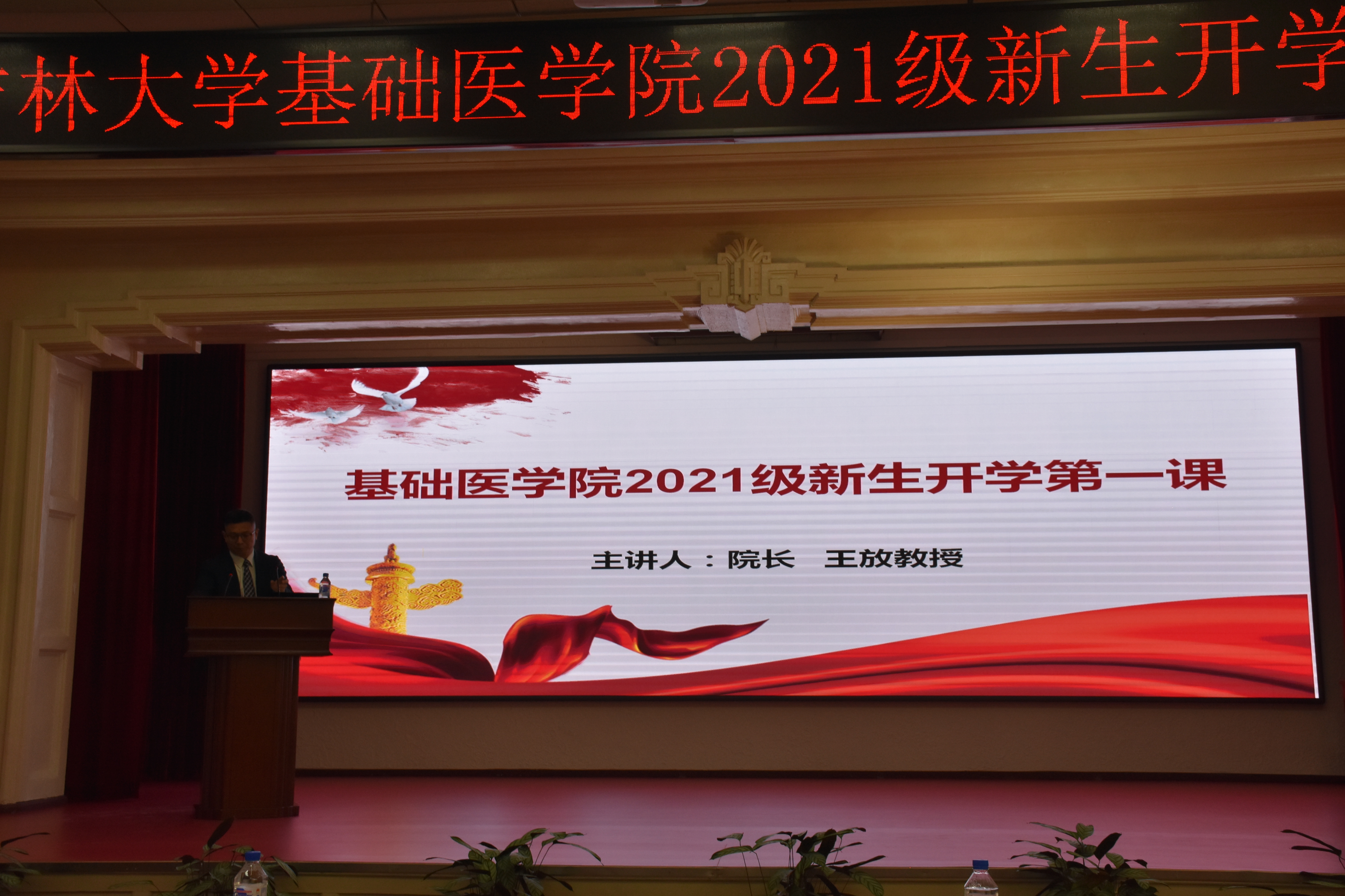 最后,王放院长发表致辞,他代表全院教职员工向25名博士生、69硕士生表示欢迎,并向辛勤培育他们的老师和家长们表示衷心感谢!希望全体同学能够赓续红色基因,传承白求恩精神,珍惜在云顶国际8588yd每一分时光,充分利用学院优质资源、砥砺拼搏、成为有传承、有担当、有情怀的基础人。随后,王院长为全体新生讲授了“开学第一课”,鼓励大家应以本届诺贝尔生理学或医学奖获奖的两位科学家大卫·朱利叶斯和阿登·帕塔普蒂安为榜样,在基础医学领域深海探索,以为人类发展做贡献为己任。在学习和科研的同时要肩负民族使命,做到诚实正直,博学笃志。王放院长对同学们提出殷殷期望:一是要将被动学习转变为主动学习,阅读文献,学习实验技术;二是在专业上要以兴趣为导向,多于导师沟通,做自己喜欢的科研;三是永葆创新精神,做到学科交叉,学术创新;四是敢于质疑,善于思考,永远满含好奇心;五是强健体魄,内外兼修。王院长饱含深情的第一课,更是一次精彩生动的党课,他多次强调并叮嘱同学们勿忘国耻,居安思危,要坚定理想信念,厚植家国情怀,肩负使命担当,砥砺拼搏奋进,努力成为堪当民族复兴重任的时代新人,为实现伟大复兴与祖国统一而努力奋斗。