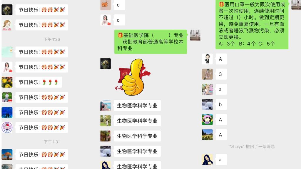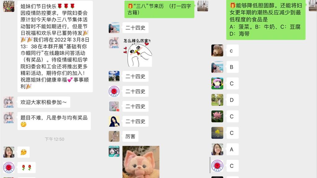 活动伊始,学院妇委会主任曹国丽向全院姐妹们表达节日的问候和祝福,同时感谢她们为学院发展建设所做出的积极贡献。随后,妇女节在线趣味问答活动在学院妇女工作微信群内开展,题目以妇女节相关知识、妇女权益维护、妇女健康保护为主线,结合工作实际,以谜语、填空、选择、图文等多种形式呈现,参与活动的老师们热情高涨,气氛欢乐,妙语连珠,精彩不断。