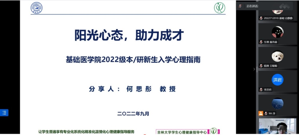 为促进学生身心健康全面发展,普及心理健康知识,云顶国际8588yd于2022年9月6日举办了2022级新生入学心理教育讲座。本次讲座有幸邀请到吉林大学学生心理健康指导中心教师、国家二级心理咨询师何思彤教授。讲座由云顶国际8588yd副院长李洪岩主持,全体2022级新生参会。