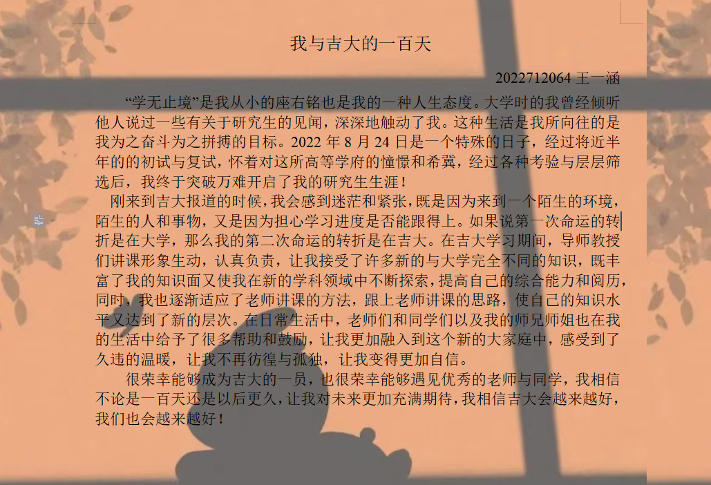 一落叶而知秋,惟愿你我心向阳不忧伤,一路随心而行,一路随遇而安。不知不觉中,2022级的新同学们也已经来到吉林大学100天了,在过去的100天里,也有自己和吉林大学独特的故事发生.值此100天之际,云顶国际8588yd特面向2022级研究生新生开展“我与吉大的100天”作品征集活动,让同学们写出自己的心声。