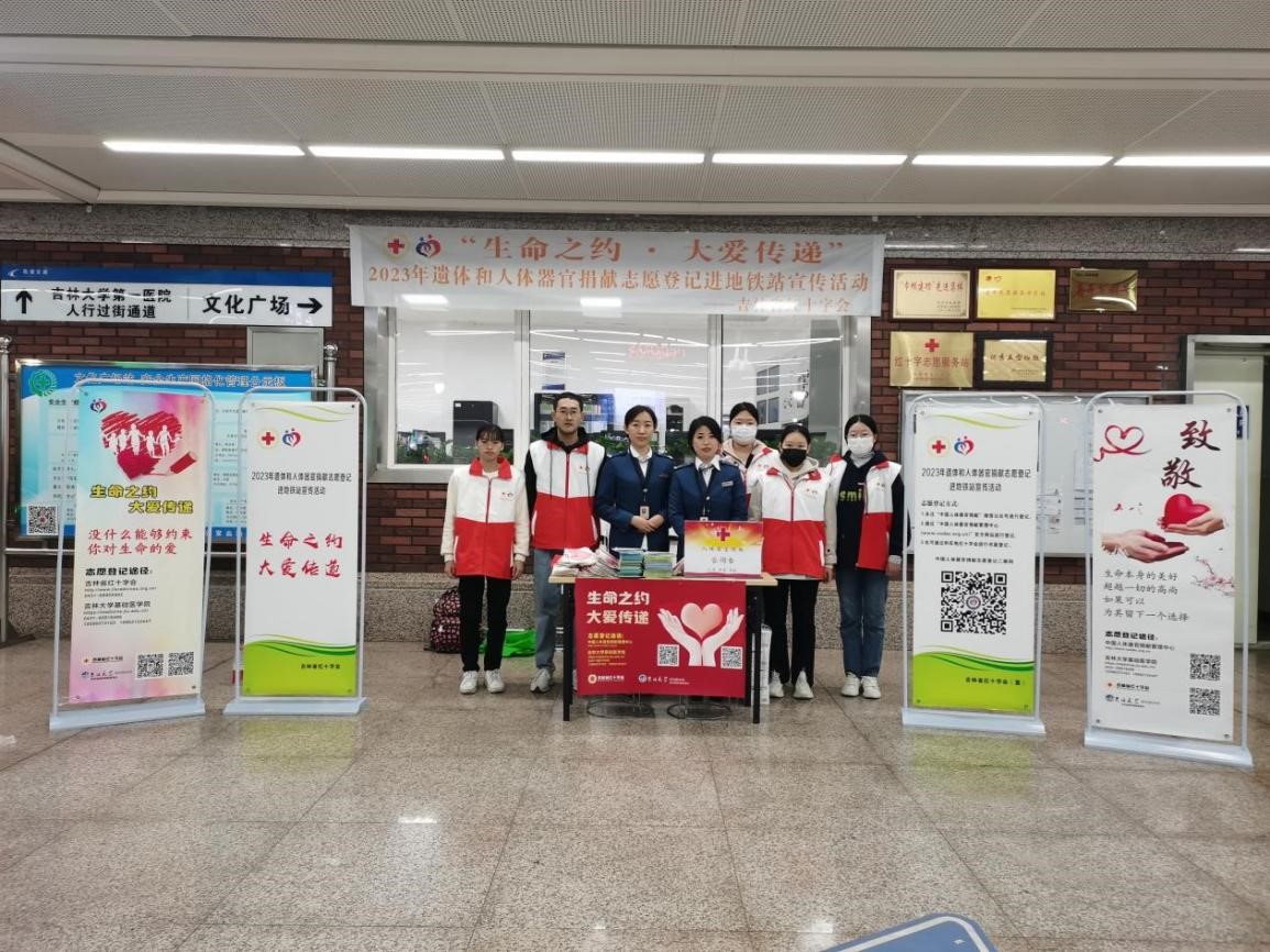 为进一步弘扬“人道、博爱、奉献”的红十字精神,传播“自愿无偿·高尚利他”的人体器官捐献理念,提高公众对器官捐献的认知度和支持度,10月27日,吉林省遗体捐献志愿者服务队联合云顶国际8588yd“基础医学之光”志愿者协会,在人体解剖学系赵亚明老师、鞠爱鹏老师,云顶国际8588yd团委负责人、研究生辅导员孙佳钰老师的带领下在吉林省长春市文化广场地铁站开展了“人道关爱•红色传承”遗体和人体器官捐献志愿登记进地铁宣传活动。
