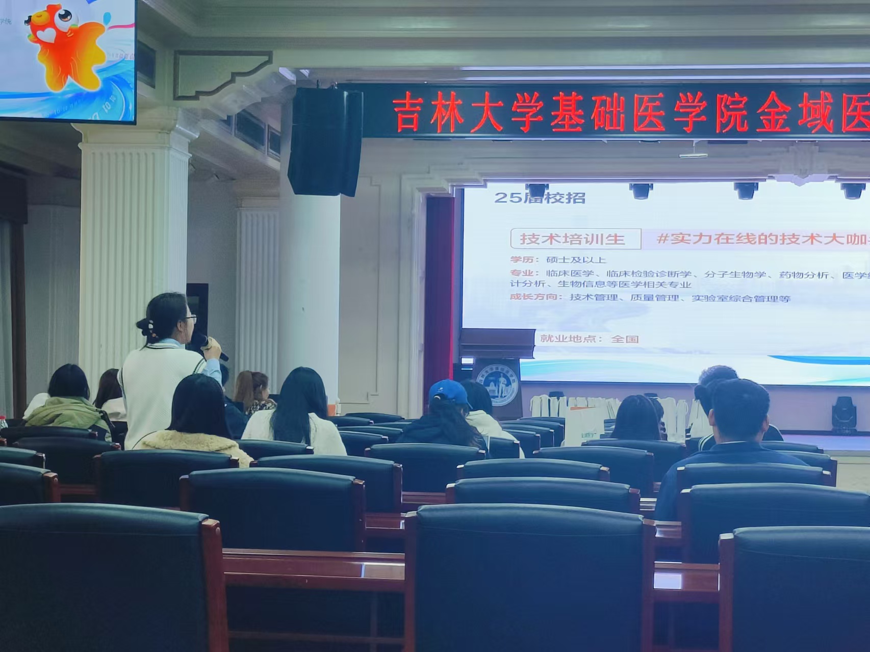 随后,吉林大学校友、吉林金域市场部血液肿瘤条线产品经理、科研负责人郇有为学长给同学们分享了他在金域医学集团的成长故事。他从自身角度出发为同学们讲述了选择金域公司的原因以及在金域的发展;郇先生的亲身经历和心路历程,让在场的同学们感受到了金域医学集团良好的工作氛围和发展平台。最后工作人员详细介绍了金域医学2025年校园招聘的岗位需求、应聘方式以及招聘流程,并提醒同学们注意查收面试信息。