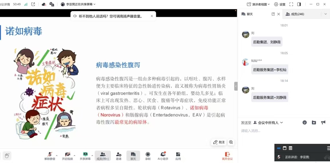 讲座特邀吉林大学第一医院小儿呼吸科副主任李亚男主讲。李主任从专业角度详细讲解了流感、诺如病毒、水痘、手足口病、麻疹、结核病等春季校园常见传染病的发病症状。同时,李主任详尽传授了预防措施,要加强个人卫生,公共场所要定期通风、消毒,要保持规律作息,合理膳食,适当增强户外运动,增强体质。若出现疑似传染病症状,应及时就近就诊。他强调接种流感疫苗的重要性,未来将继续引导师生、基础性疾病患者等重点人群接种流感等疫苗,提升人群免疫水平。