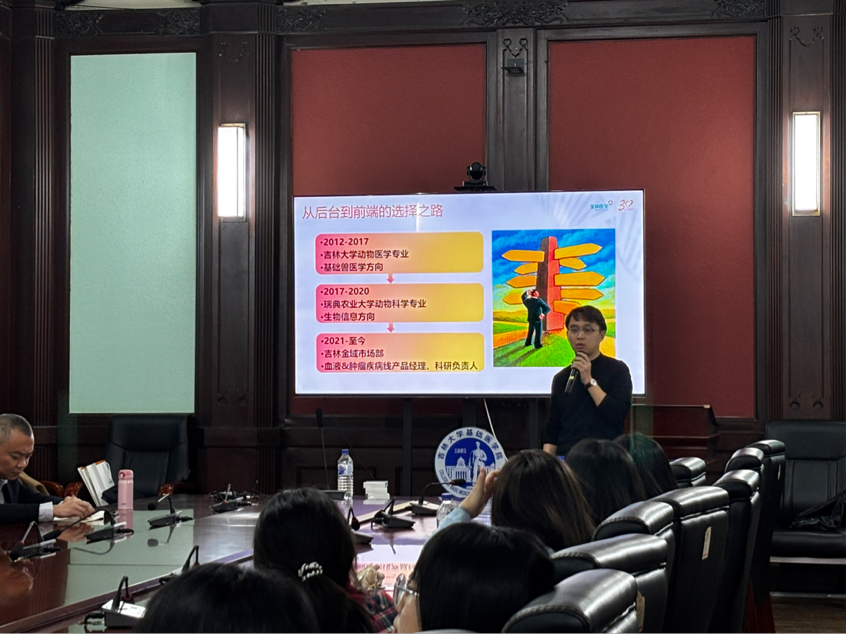 在校友分享环节,吉林大学2012届校友、现任吉林金域市场部产品经理及科研负责人郇有为校友结合自身经历,向同学们分享了其在金域医学的职业发展历程。他从择业初衷、岗位成长、能力提升等方面进行了生动讲述,真实展现了金域医学良好的工作环境与广阔的发展平台,为在场同学提供了宝贵的职业参考。