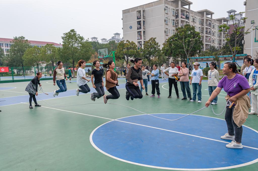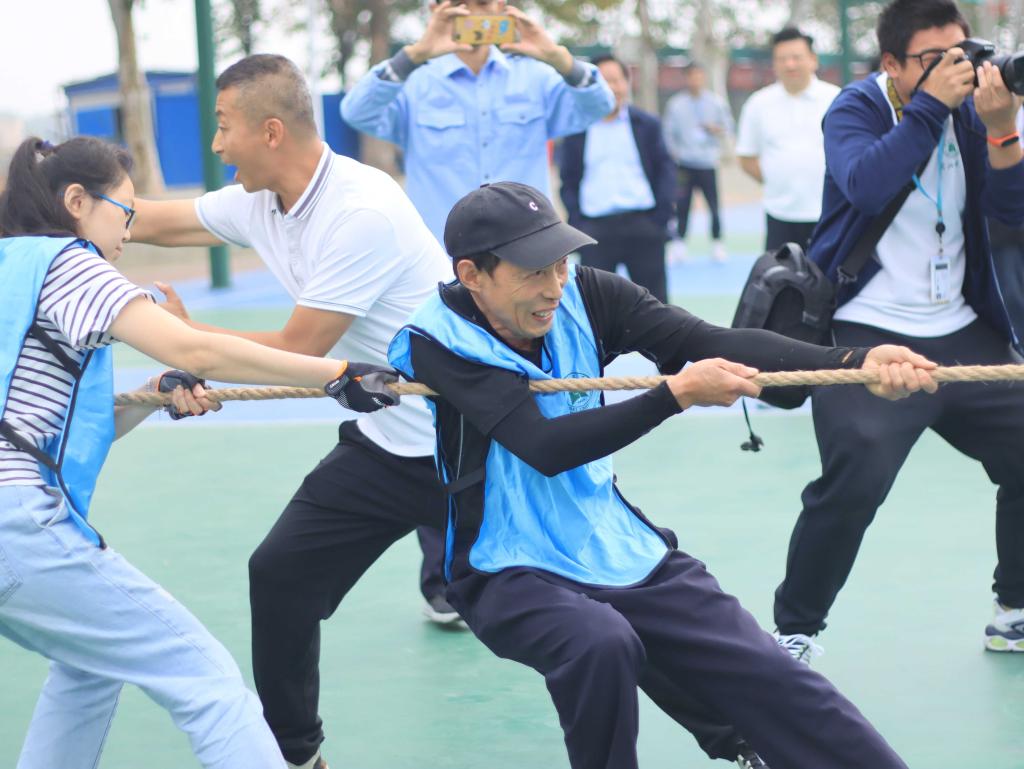 紧接着开展的是拔河比赛。参赛教职工纷纷穿上各色马甲,摩拳擦掌。在“一,二,三,拉——”的加油声和呐喊声中,学工队以突出的表现赢得了拔河比赛的第一。与此同时,其他的队伍也不甘示弱,互相配合,将场上氛围带到高潮。在随后的跳大绳和两人三足接力比赛中,参赛人员竭尽全力,场上欢笑声、欢呼声不断。