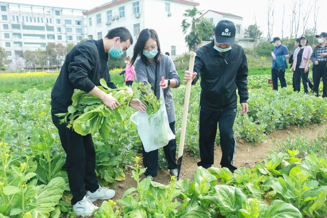 最后,机关党员代表来到学院劳动教育基地参观。“这边是莴苣和上海青,还有这些土豆,发芽后生长的很快。” 辅导员朱奎闽一一介绍一学年以来学院劳动教育的成果,机关党员代表们纷纷被吸引,还有老师蹲下和学生一起摘菜。在机关党员代表和师生的共同努力下,共采摘四十余袋蔬菜。学生们自发地在采摘后将蔬菜送给老师品尝,感谢老师们的辛勤付出。