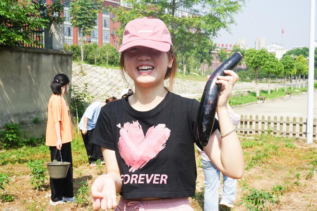 “看!我摘的这个茄子好大。”2022级新闻传播学类专业的钟嘉欣笑着向同伴展示她刚从菜地里采摘的新鲜茄子。6月9日上午,我院劳动实践指导老师李少华,辅导员韩烨丹、王路与50余名通识学子来到学院劳动实践教育基地一起采摘盛夏丰收的果实。