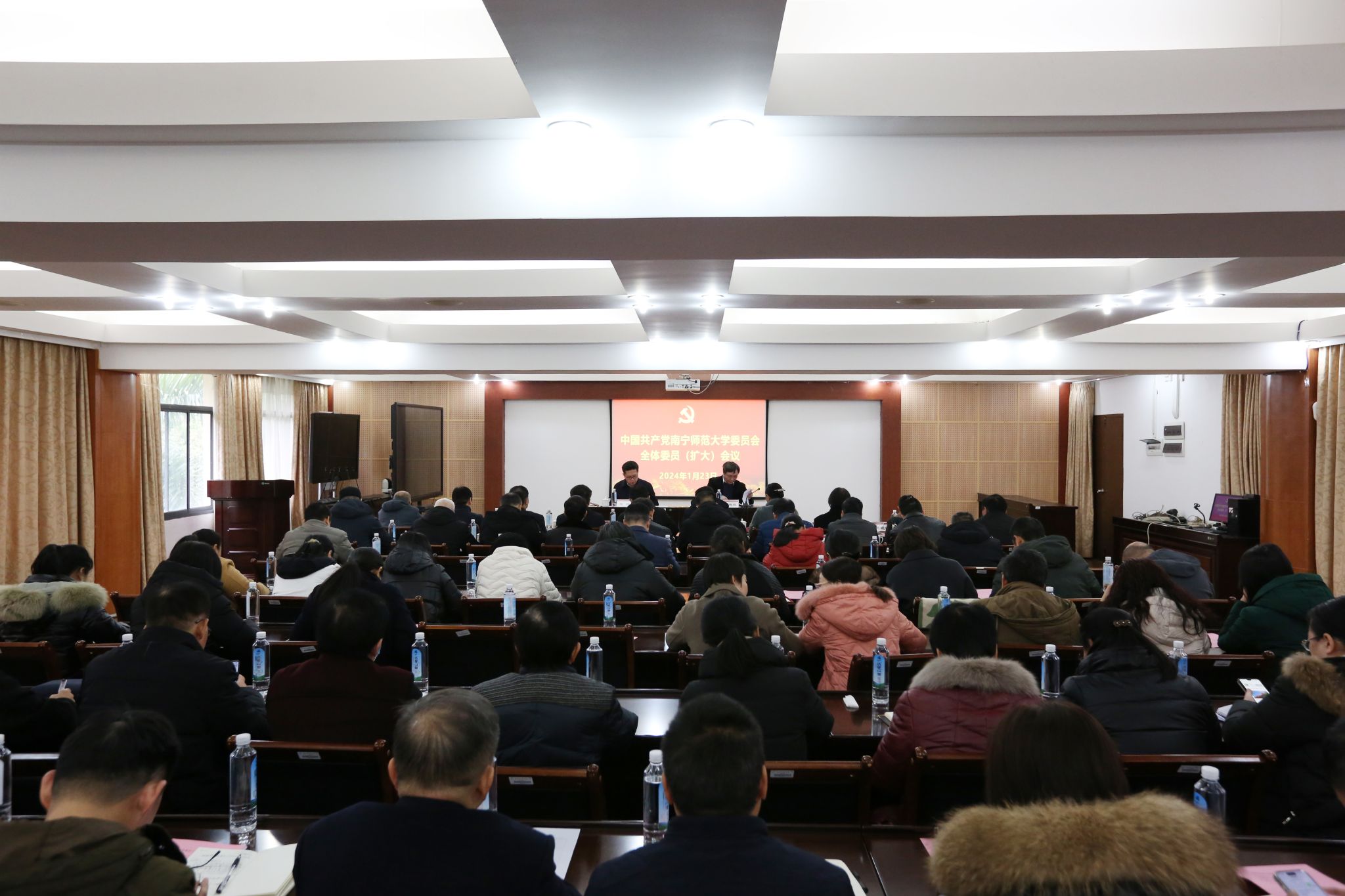 张鹏书记向党委全委会报告2023年党委工作。张书记指出,2023年学校党委坚持以习近平新时代中国特色社会主义思想为指导,深入学习贯彻党的二十大精神,加强党对学校工作的全面领导,落实立德树人根本任务,团结带领全体师生员工,坚持稳中求进、攻坚克难、担当作为,区域特色鲜明的高水平师范大学建设取得新进展,各项工作取得新成效。张书记从两个方面回顾了2023年以来党委主要工作:一是加强党的全面领导,办学治校能力有效增强。主题教育深入开展,理论武装持续深化,意识形态阵地更加巩固,基层战斗堡垒不断夯实,干部队伍建设不断强化,统战群团离退工作同心同向,“两个责任”切实扛紧,积极助力乡村振兴,高质量完成建校70周年系列庆祝活动。二是坚守立德树人初心,教育高质量发展开新局。现代大学制度体系日臻完备,人才培养再添硕果,学位与研究生教育有效强化,科研创新再获佳绩,人才强校再攀新高,招生就业再创新高,社会服务效益凸显,对外合作深入拓展,办学条件持续改善。