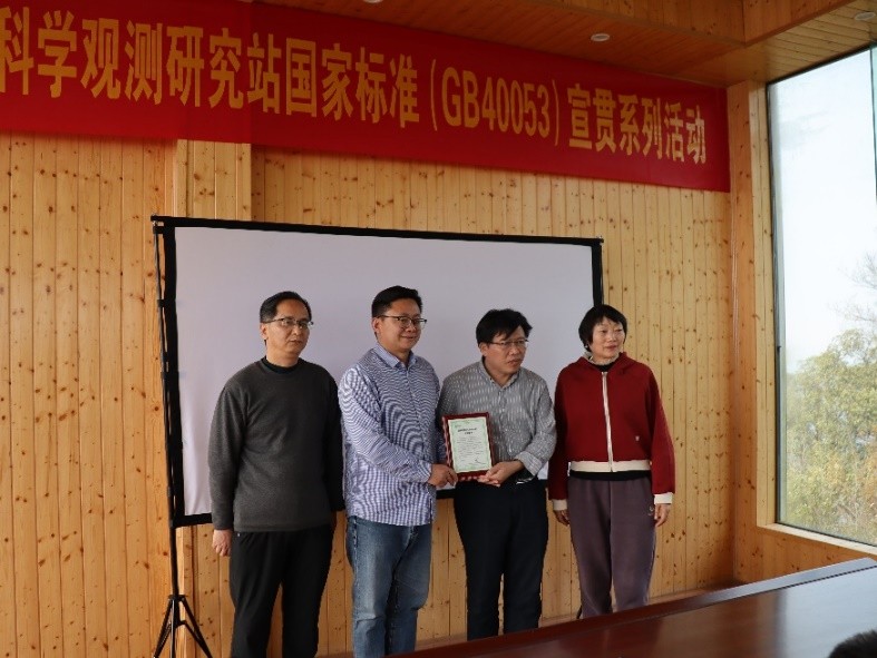 活动中,专家组成员先后到金钟山河口站、当劲山站、山顶站等现场检查咨询了综合科研实验楼建设、野外观测站建设与观测仪器设备安装等工作,并针对站点建设存在问题提出建设性修改意见建议。认证会议由CFERN中心主任王兵主持,首先由王兵主任致开幕辞,介绍各位认证专家、参会代表,南宁师范大学肖琦副校长、唐杰副县长和广西壮族自治区林业局科技处卢书兵分别做致辞发言。南宁师范大学陈伟才研究员做国家标准(GB 40053)的认证申请汇报,与会的13位专家结合实地踏查结果逐一对认证报告中的建议方案进行了详细质询并提出意见和建议。与会专家一致通过广西百色金钟山野外科学观测研究站国家标准(GB 40053)认证,并颁发国家标准(GB 40053)认证证书。我校代表地理与海洋研究院胡宝清院长表示将联合各共建单位严格按照国家标准完成广西百色金钟山野外科学观测研究站的建设工作。最后,王兵首席主持了揭牌仪式,参会代表集体合影留念。