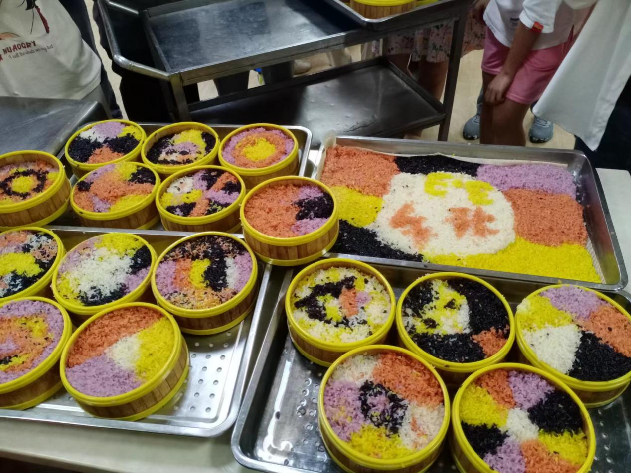 3月30日下午,学校后勤处带领伙食管理委员会的同学们共同制作具有浓郁广西民族特色的五色糯米饭。活动当天,食堂的工作人员向同学们介绍了五色糯米饭的制作方法和文化寓意,随后大家便投入到紧张而有趣的制作过程中。同学们分组协作,有的负责浸泡糯米,有的负责熬煮染料,有的则负责将染好的糯米拌匀。整个制作过程充满了欢声笑语。经过几个小时的努力,五种颜色的糯米饭终于出锅,同学们纷纷品尝自己亲手制作的五色糯米饭,脸上洋溢着满足和自豪的笑容。
