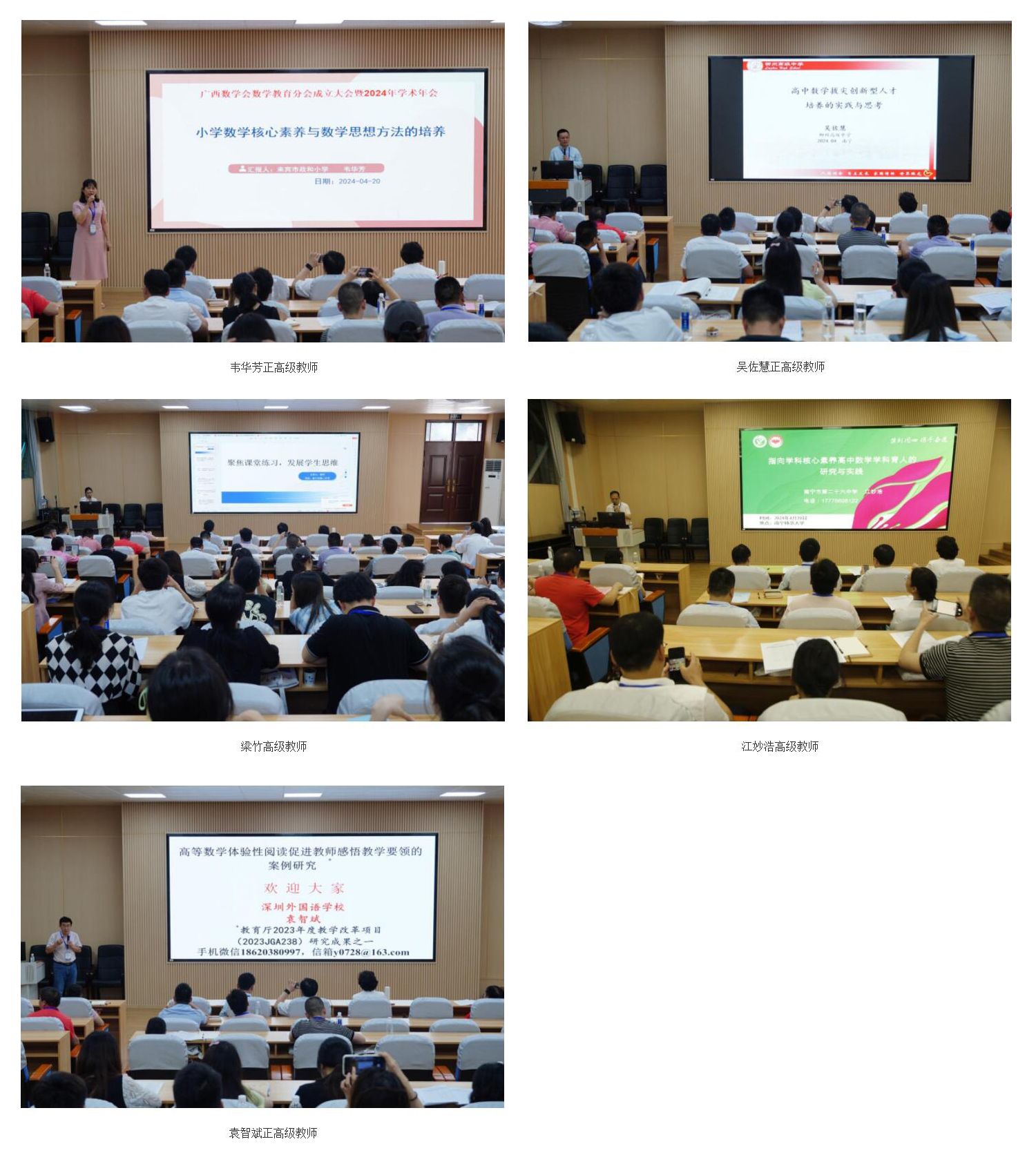 本次基础教育论坛邀请了众多专家学者作报告。其中,喻平教授作了题为《发展学生核心素养:数学教育的共同追求》的报告,王长平教授作了题为《基础教育拔尖人才培养研究与实践》的报告,王光明教授作了题为《父母数学教育期望、子女数学学业信念与数学学业成就间的关系:系列研究》的报告,黎海英教授作了题为《教育教学论文的写作与投稿》的报告,南宁二中副校长、正高级教师岑盛锋作了题为《让深度学习在课堂中真实发生》的报告,南宁十四中副校长、正高级教师蒙裕劲作了题为《把握脉搏,立足岗位,为党育人,为国育才——谈学科核心素养如何在课堂教学中落地》的报告,来宾市政和小学正高级教师韦华芳作了题为《小学数学核心素养与数学思想方法的培养》的报告,柳州高级中学视导室主任、正高级教师吴佐慧作了题为《高中数学拔尖创新人才培养的实践研究》的报告,南宁市第三中学高级教师梁竹作了题为《“三新”背景下高中新授课课堂练习的实践研究》的报告,南宁二十六中副校长、高级教师江妙浩作了题为《学科素养下的高中数学学科育人的研究》的报告,深圳外国语学校袁智斌教授作了题为《高数体验性阅读促进教师感悟教学要领的案例研究》报告。报告内容围绕师范生应具备的专业素养和教学能力,针对数学专业本科师范生培养目标定位的准确性和科学性、专业课程设置的合理性、教学实践环节实施的有效性等方面开展,报告内容契合当下基础教育发展实际,获得参会人员的高度评价。