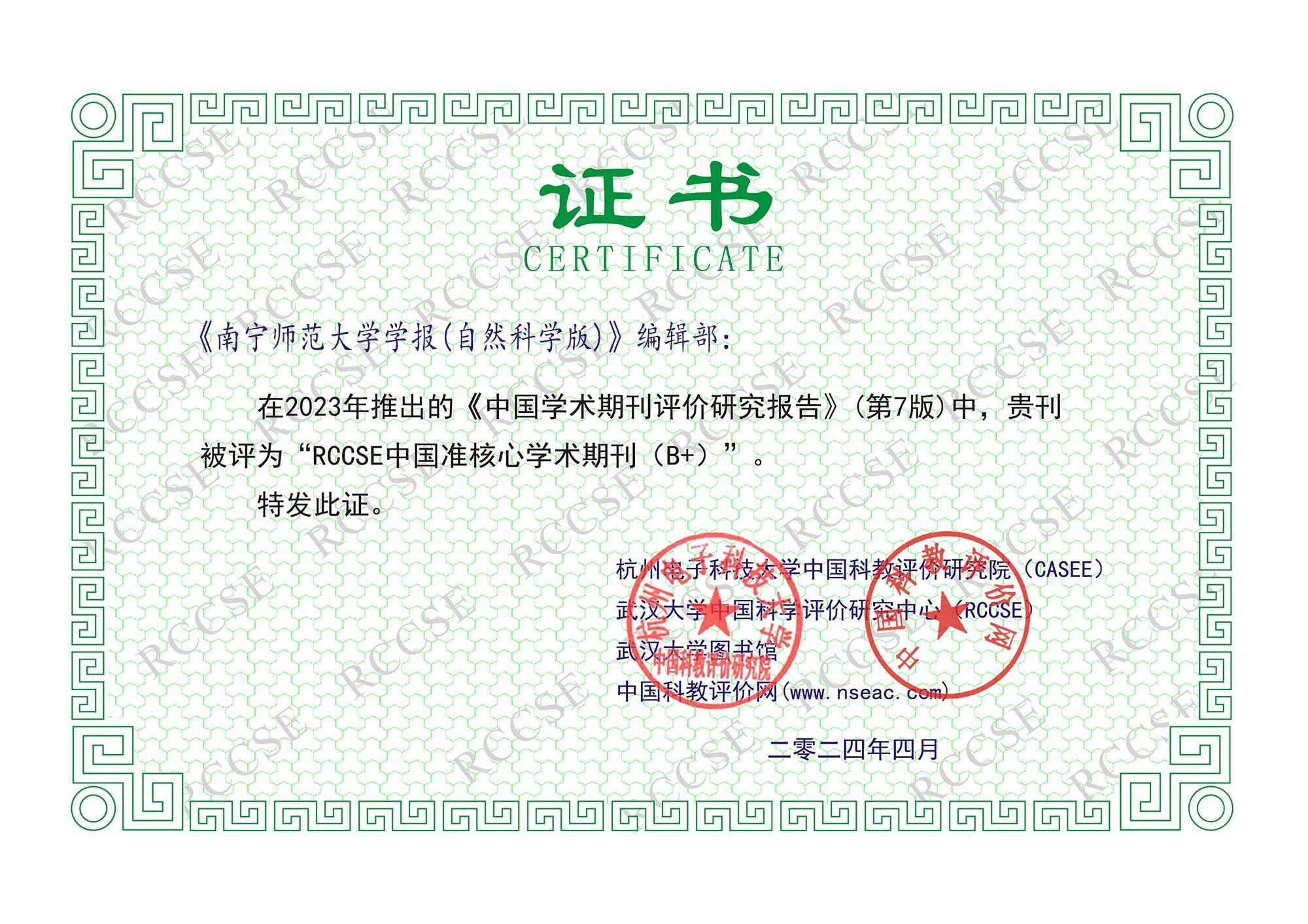 《南宁师范大学学报(哲学社会科学版)》在2023年度《中国学术期刊评价研究报告》(第7版)中,再次被评为“RCCSE中国核心学术期刊(A)”,在参评的6469种中文学术期刊中位列5%-20%,在424种人文科学综合期刊中排名68位,较之2020年度第6版的74位排名有所提升。《南宁师范大学学报(自然科学版)》在2023年度《中国学术期刊评价研究报告》(第7版)中,再次被评为“RCCSE中国准核心学术期刊(B+)”,在参评的6469种中文学术期刊中位列30%-60%,在175种自然科学综合期刊中排名142位。