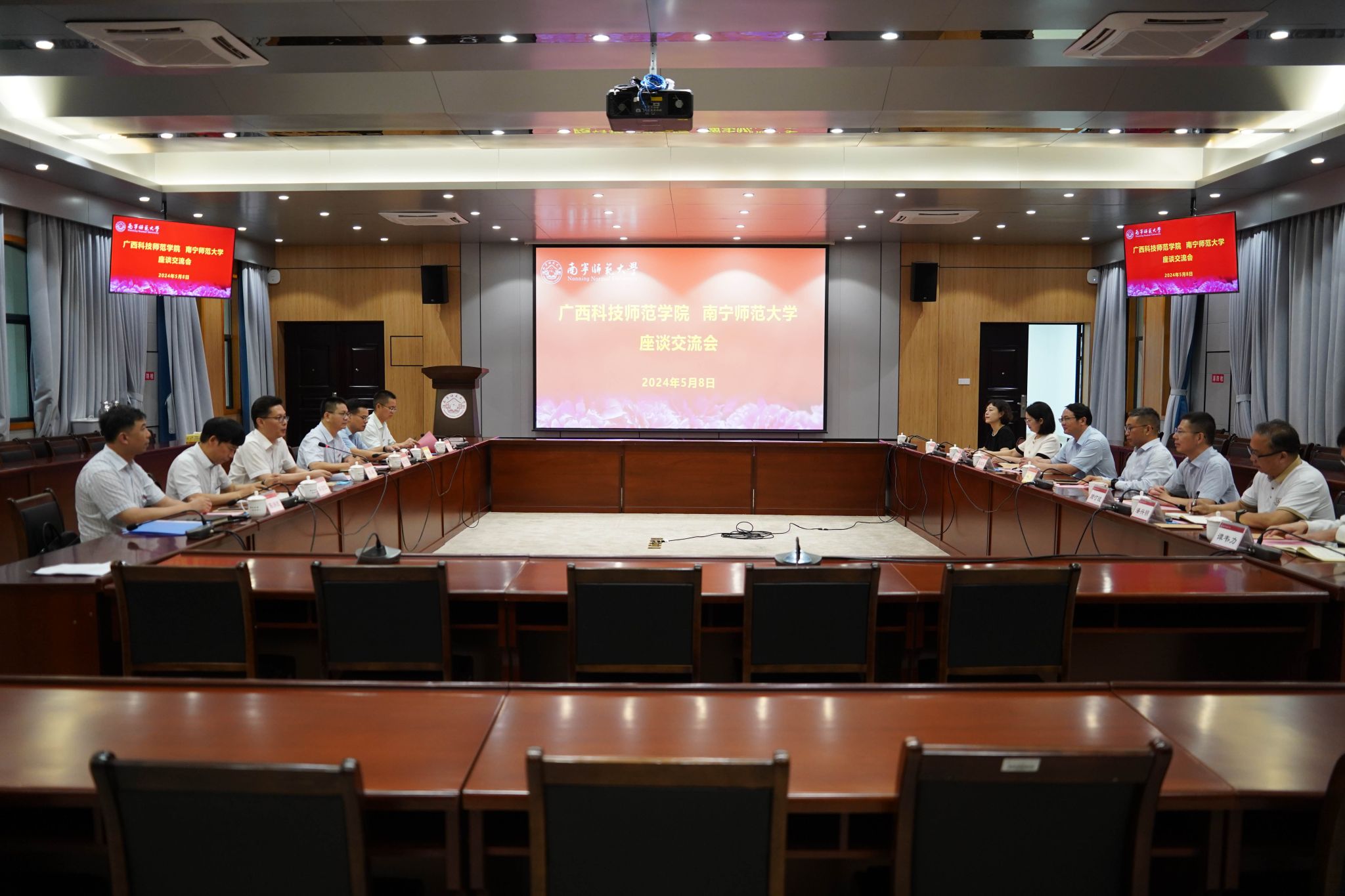 5月8日上午,广西科技师范学院党委书记杨杰、副校长周叮波一行7人到我校武鸣校区考察交流。我校党委书记张鹏、副书记隆广庆热情接待了杨杰书记一行。党办校办、组织部、宣传部、人事处等部门负责人参加座谈交流会。会议由张鹏书记主持。