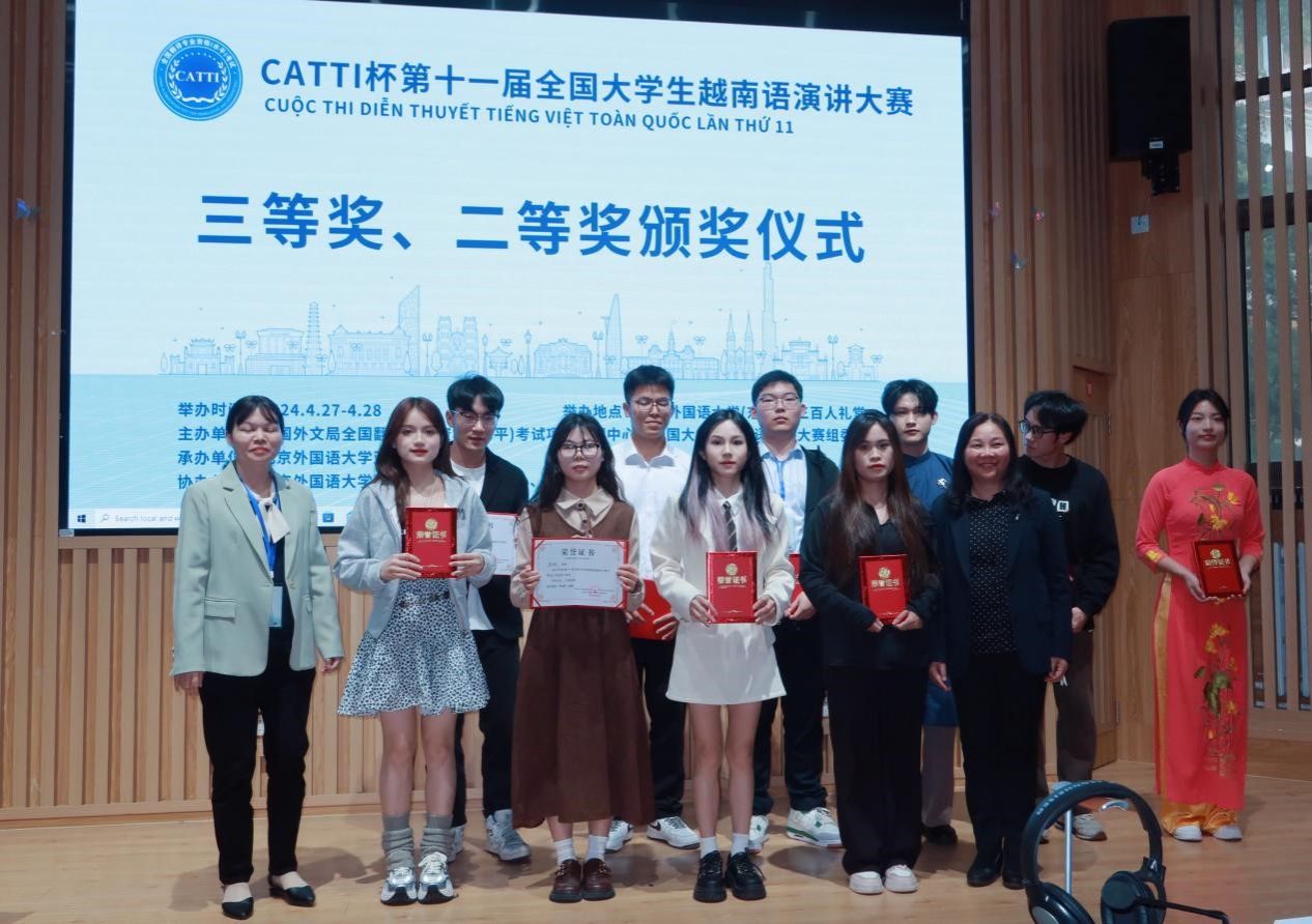 4月27日-28日,CATTI杯第十一届全国越南语演讲大赛暨越南语教学研讨会在北京外国语大学举行,我校国际教育学院越南语专业罗媛、覃瑞莲两名大三同学由越南语专业陆雪梅老师指导并带队参赛。在激烈的角逐中,我校参赛学生展现出良好的越南语专业素养和沉着冷静的应赛能力。在定题演讲环节,罗媛同学以《我与祖国共成长》作为演讲主题,覃瑞莲同学以《零和博弈》作为演讲主题,均得到了评委的一致好评,并且在即兴演讲环节发挥优异,最终罗媛同学获得了大三年级组一等奖,覃瑞莲同学获得了二等奖。