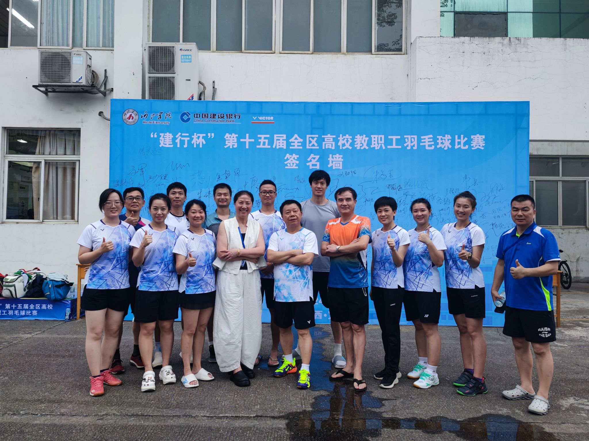 5月28日至5月31日,由自治区教育厅主办、河池学院承办、广西学校体育卫生艺术学会协办的“建行杯”第十五届全区高校教职工羽毛球比赛在河池学院举行。比赛分为校长组和混合团体组,全区高校共有51所本专科院校近700名运动员参加本次比赛。我校由校工会牵头,组织了16名教职工组成代表队参加了比赛。