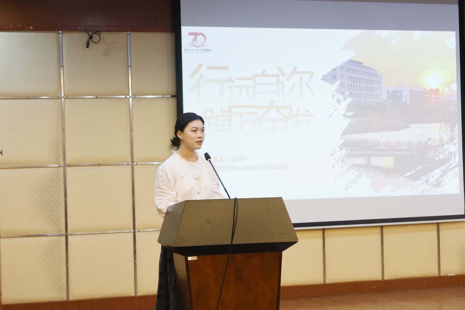 来自外国语学院的陈沐楠以“青春无问西东,奋斗自成芳华”为题讲述大学四年的成长故事。她脚踏实地,认真投身于本专业的知识学习,不断努力去提升自己的弱项,于今年考取了中国科学院大学外语系的硕士研究生,继续走在自己热爱的道路上。她希望大家能够珍惜经历,去自己的舒适区之外看看,在经历中成为更好的自己。