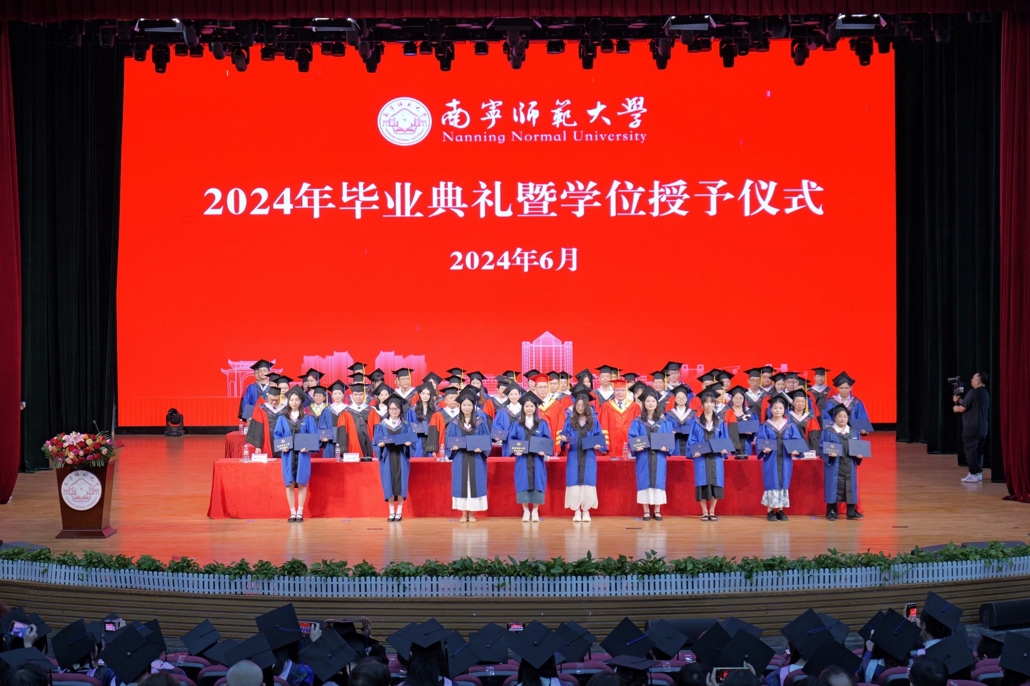 肖琦副校长宣读了南宁师范大学2024届学生毕业及学位授予的有关文件。龙妮娜副校长宣读了自治区级、校级优秀毕业生表彰文件。在主席台就坐的学校领导、学校学位评定委员会委员为毕业生代表颁发毕业证书和学位证书并一一拨穗,为优秀毕业生代表颁发荣誉证书。毕业生们身着学位服、头顶学位帽,端举毕业证书,意气风发、笑容灿烂,享受毕业礼成的庄严神圣时刻。