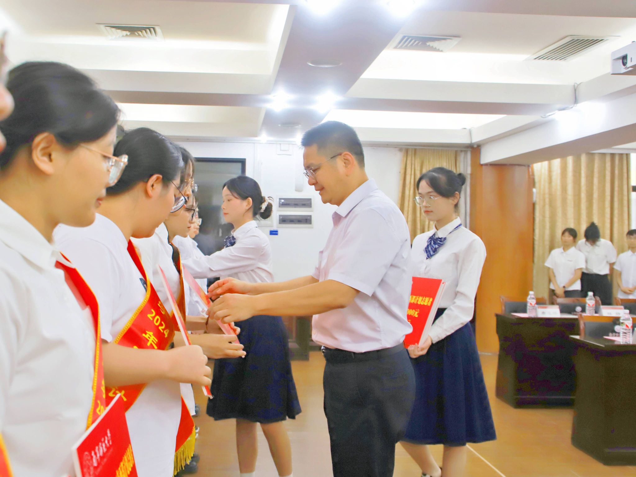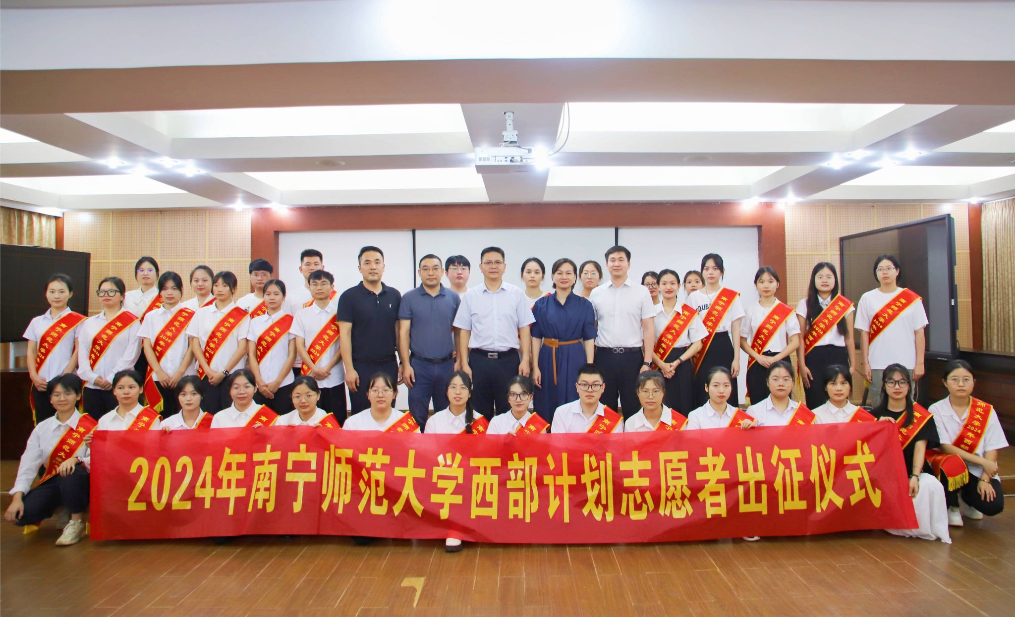会议宣读了南宁师范大学2024年大学生志愿服务西部计划志愿者名单,为2024年西部计划志愿者颁发绶带、行囊费、奖励金,赠送加油包、志愿伞和学习书籍。