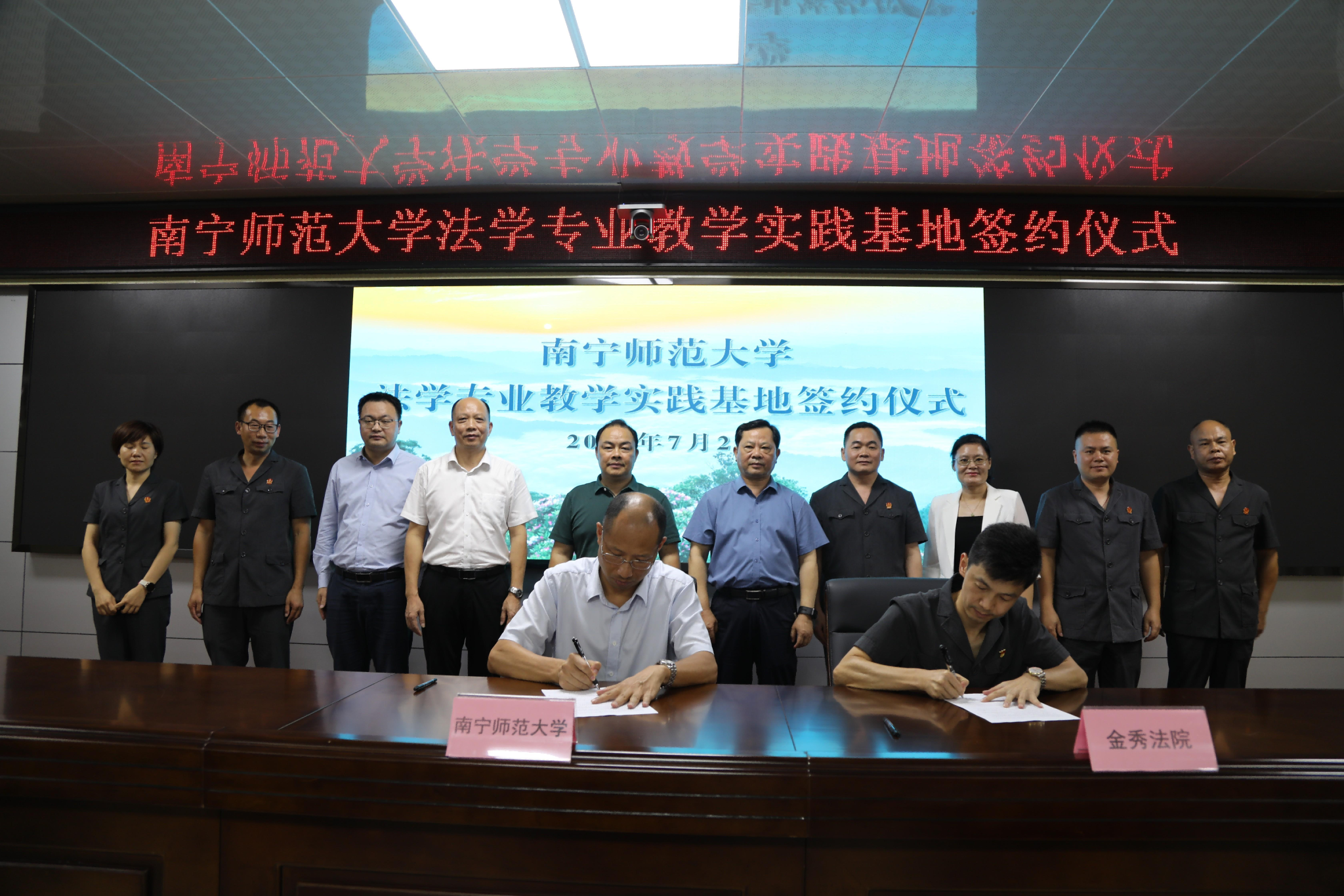 随后,与会人员就拓展院校合作领域展开了讨论交流,法学与社会学院院长尹文嘉与金秀法院院长贾凌波共同签订《南宁师范大学金秀瑶族自治县人民法院法学专业教学实践基地协议书》,与会人员共同为法学专业教学实践基地进行揭牌。